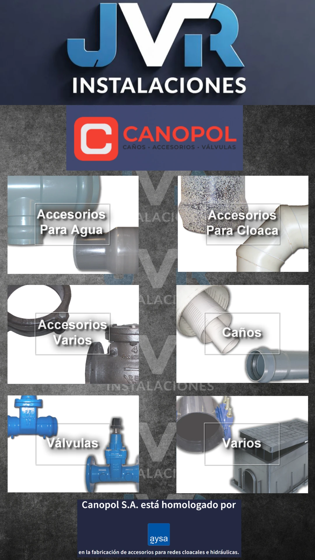 Canopol es un fabricante argentino especializado en sistemas de conducción y accesorios plásticos para redes de agua y cloaca, con soluciones extendidas a componentes hidráulicos, varias válvulas y elementos auxiliares de instalación. Su portfolio cubre desde tubería estructural hasta componentes complementarios de obra y accesorios técnicos.